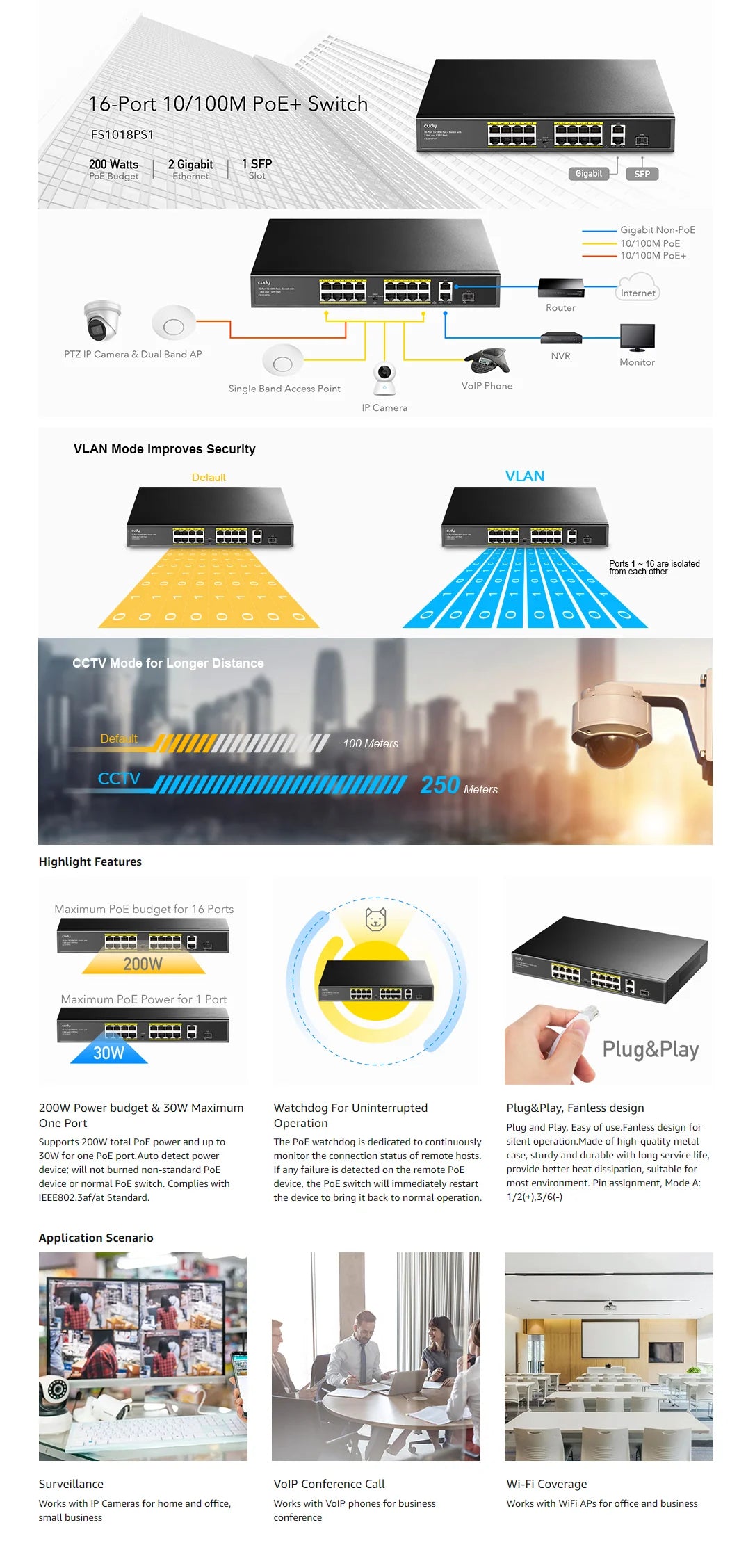 A rack-mounted 18-port PoE switch with 200W power supply and a silent cooling system.