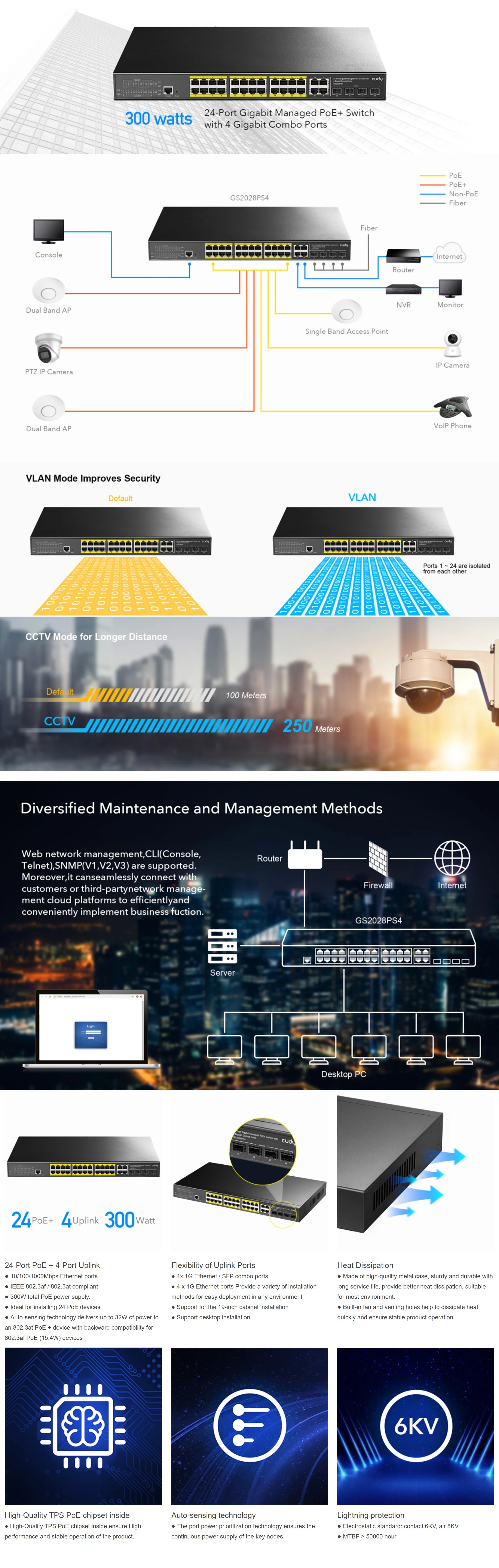 A rack-mounted 24-GbE, 4-Combo, Layer 2 PoE switch with a 300W power supply and a silent cooling system.