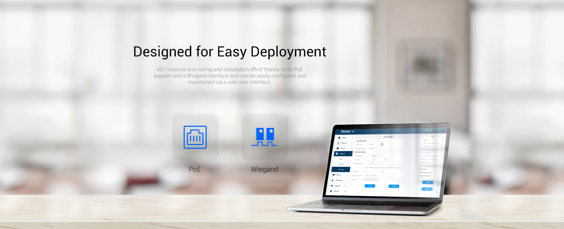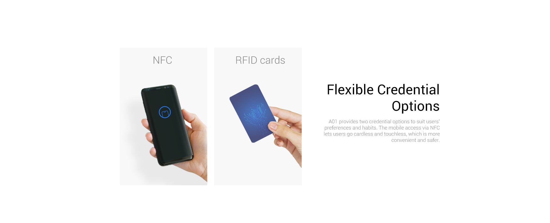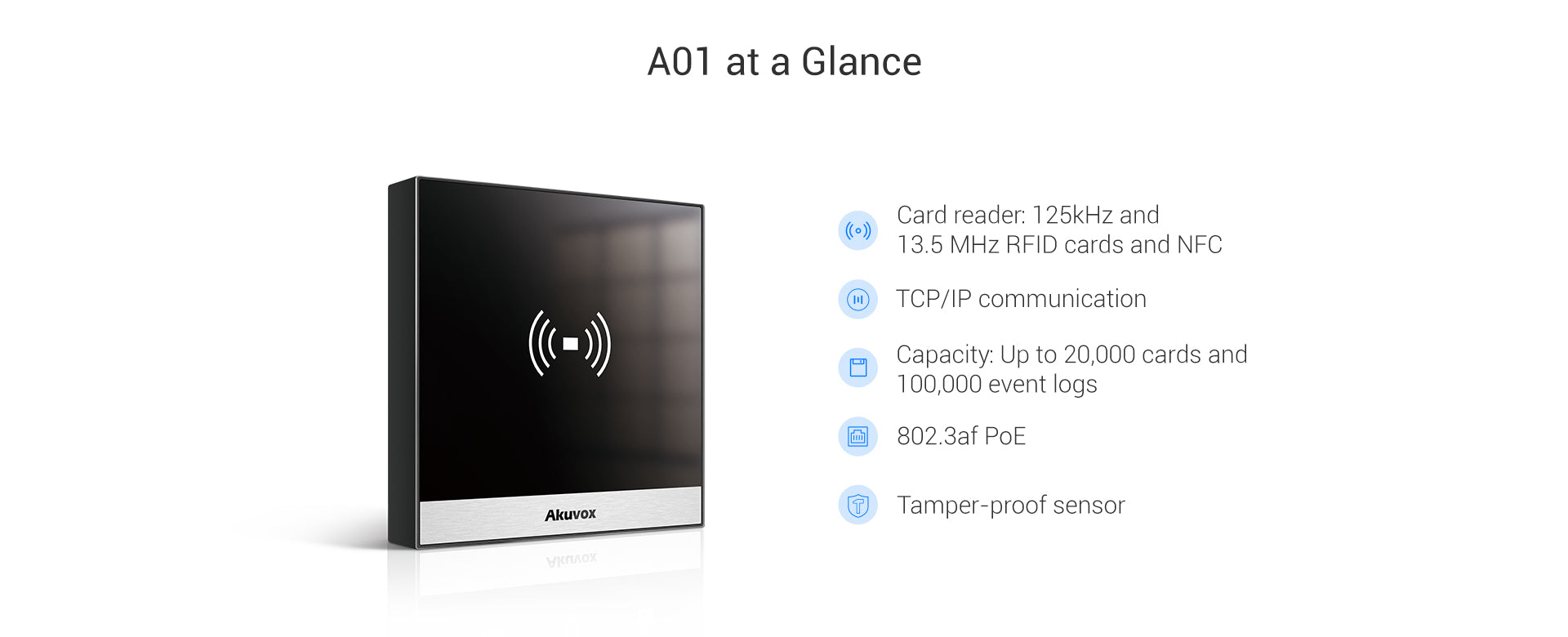 A01 is an IP-based access control terminal that combines door controller and card reader in one device. It supports RFID cards and mobile access via NFC, offering users flexibility in credential options.