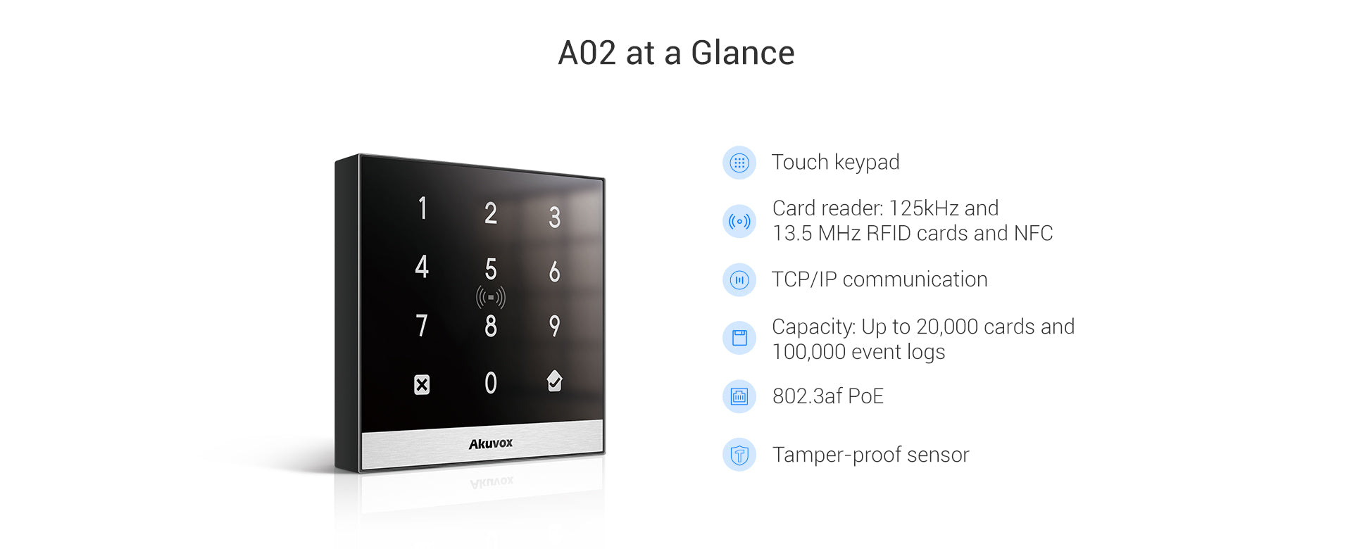 A02 is an IP-based access control terminal that combines door controller and card reader in one device. It supports PIN codes, RFID cards, and mobile access via NFC, offering users flexibility in credentials options.