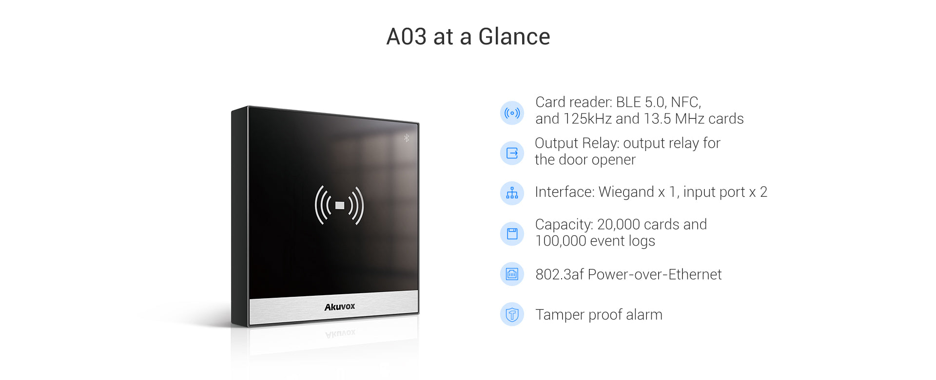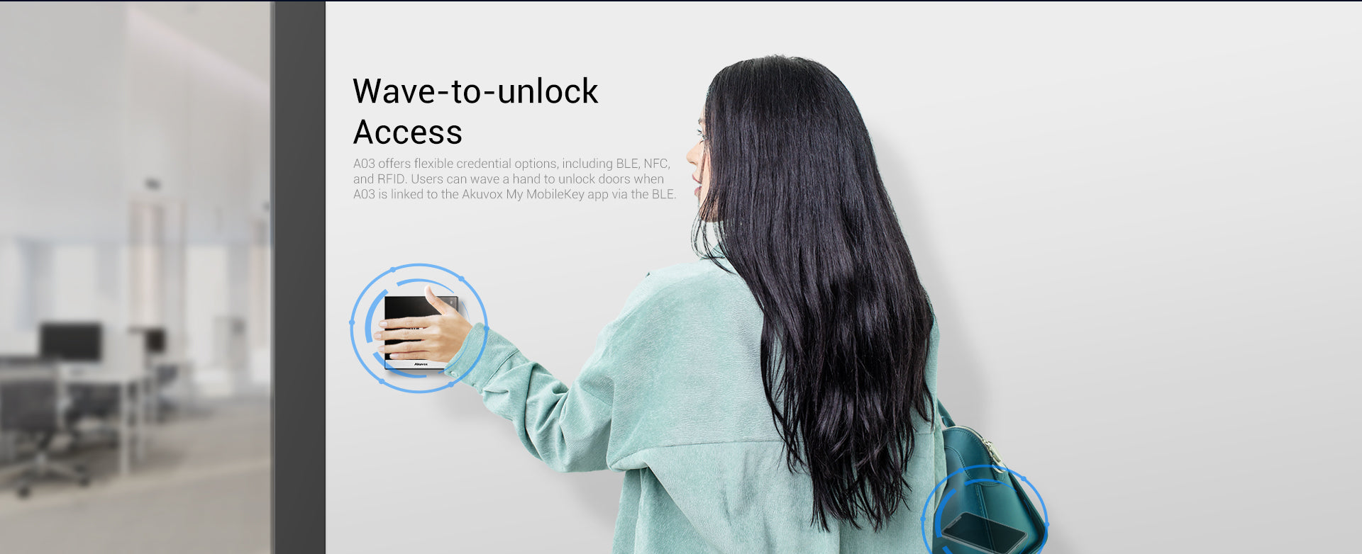A03S is an IP-based access control terminal combining a reader and a door controller. It offers flexible credentials, including wave-to-unlock via Bluetooth, mobile access via NFC, and RFID cards.