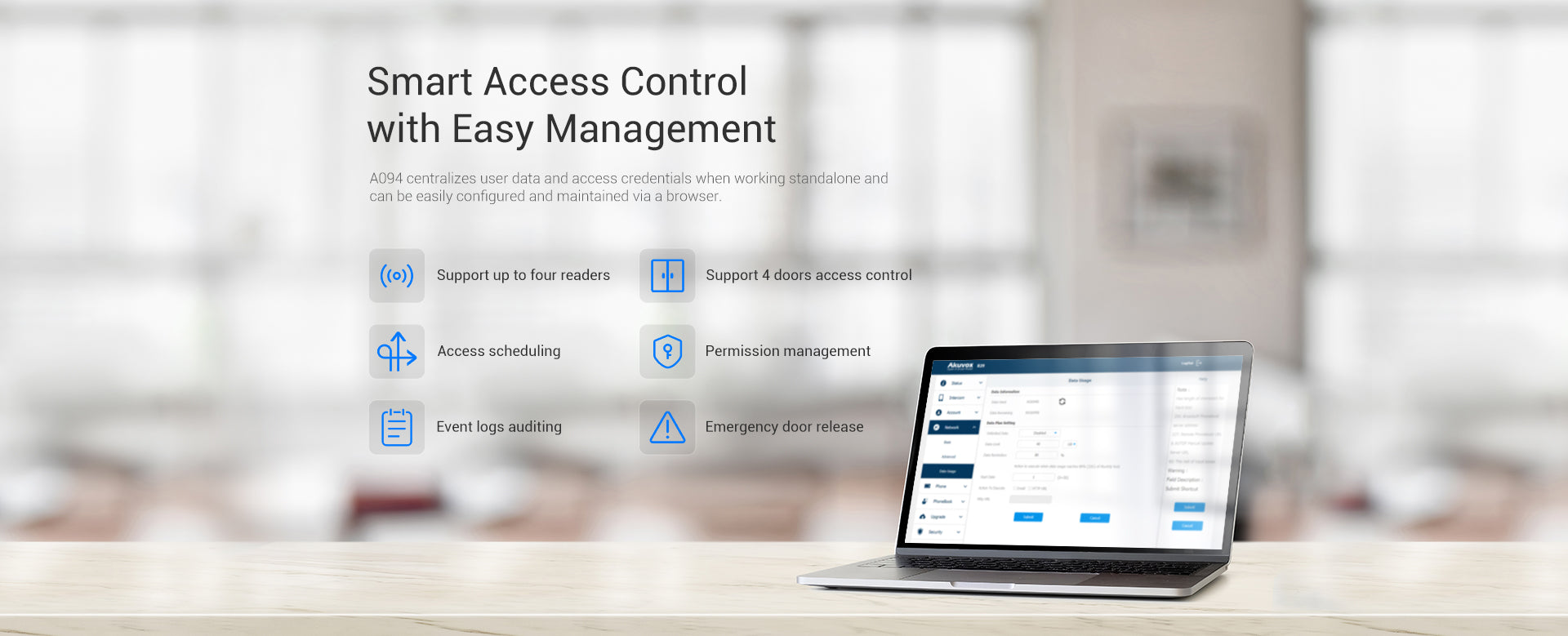 Akuvox A094 is an intelligent access controller housed in a stylish SGCC cabinet. It provides the advantages of access control of four doors over a centralized system. Supporting standalone and networked deployment, it can be applied to projects of various scales.