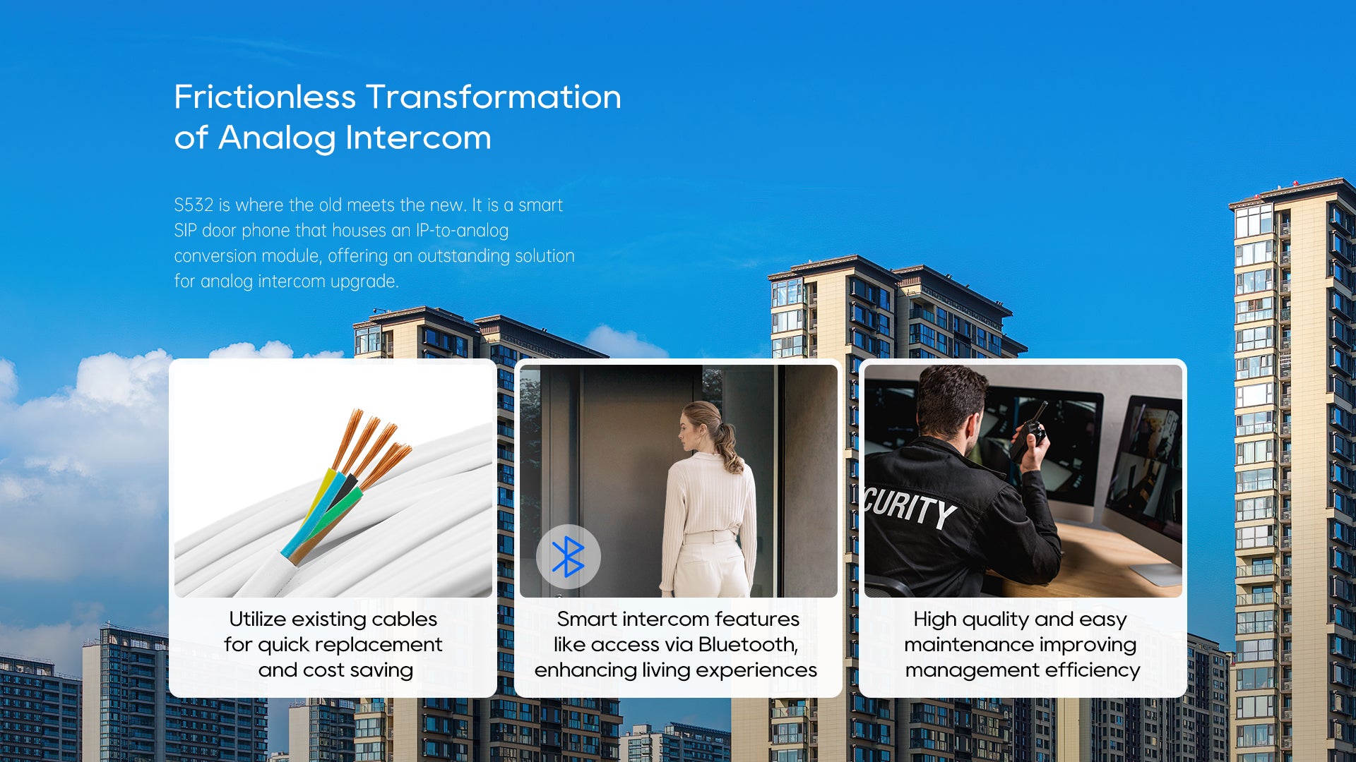S532 is where the old meets the new. It is a smart SIP door phone that houses an IP-to-analog conversion module, offering an outstanding solution for analog intercom upgrade.