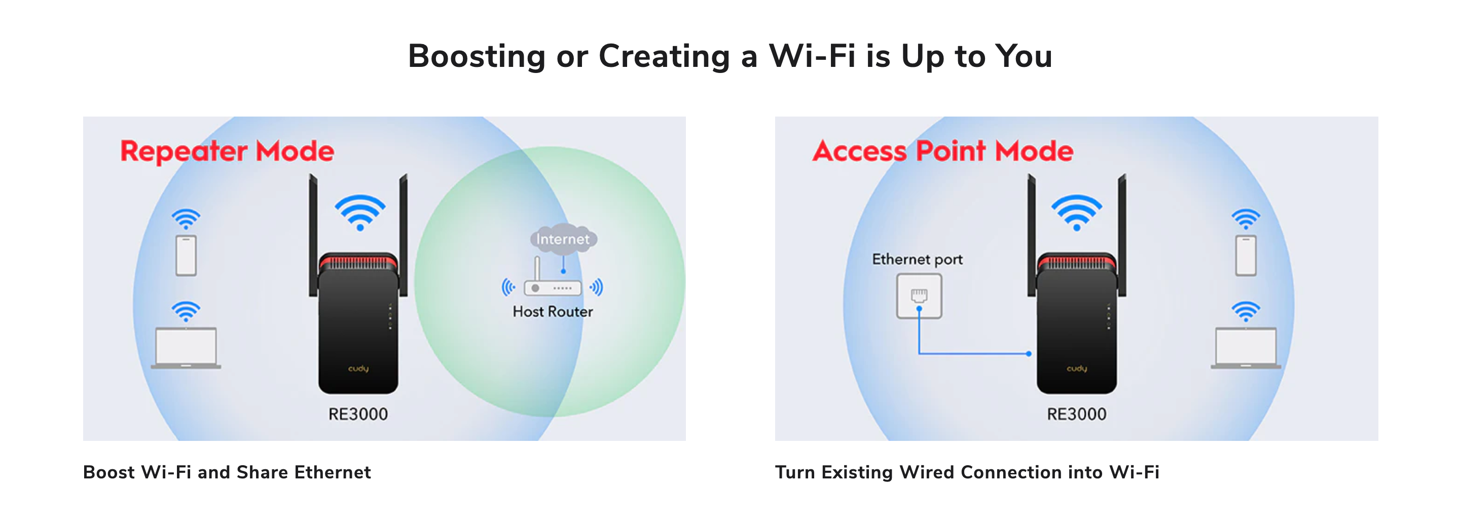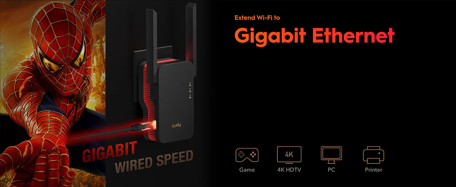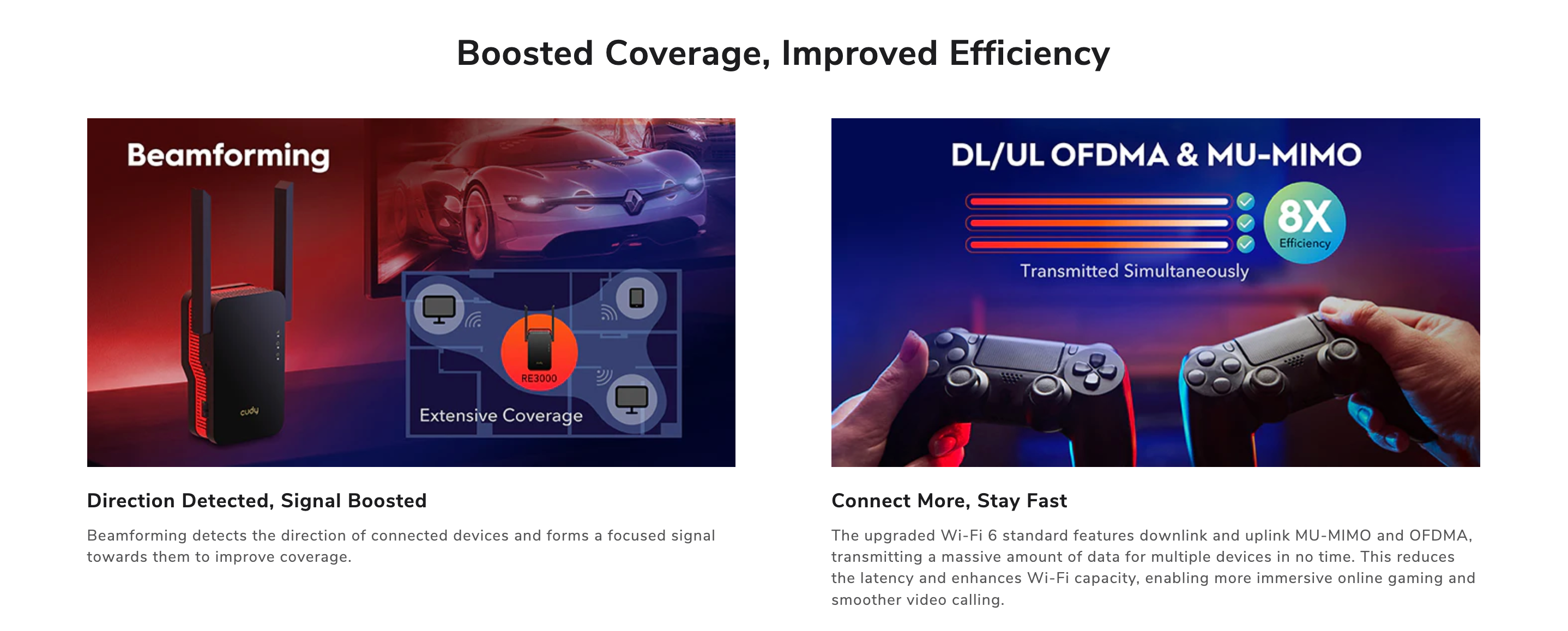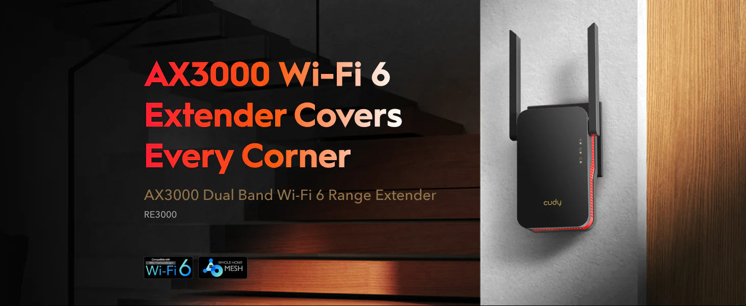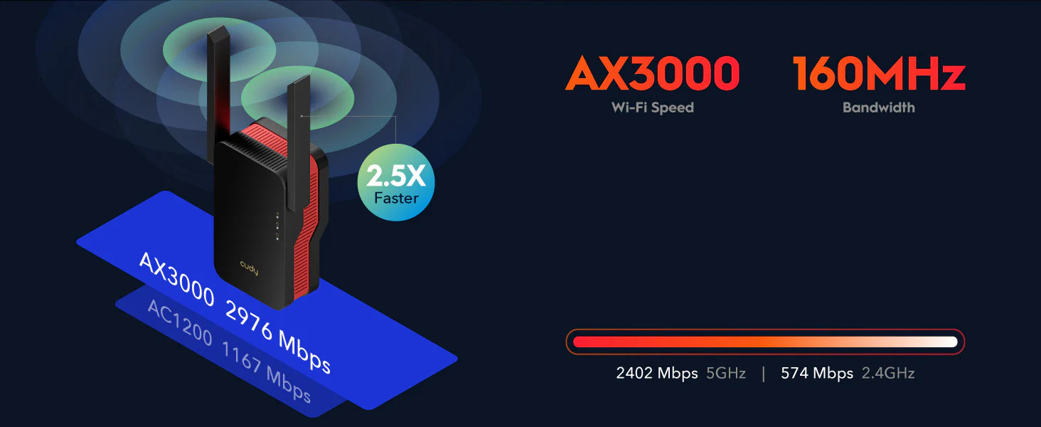 A range extender featuring high-capacity AX3000 WiFi 6 and a Gigabit Ethernet port. Press WPS buttons to expand existing Wi-Fi instantly.