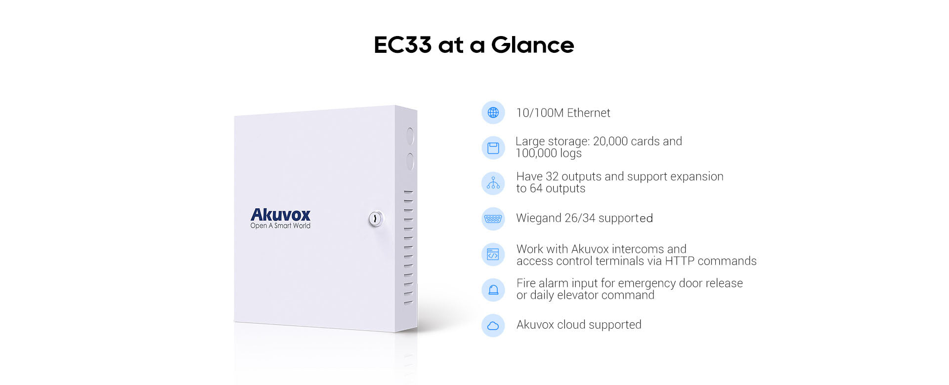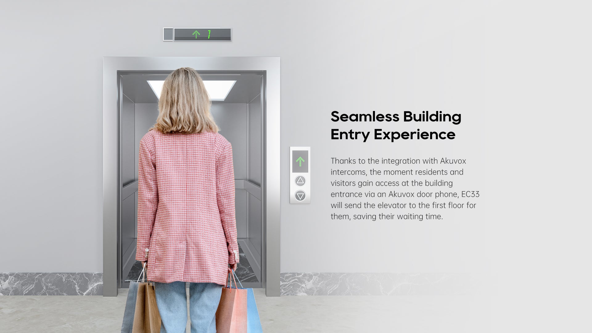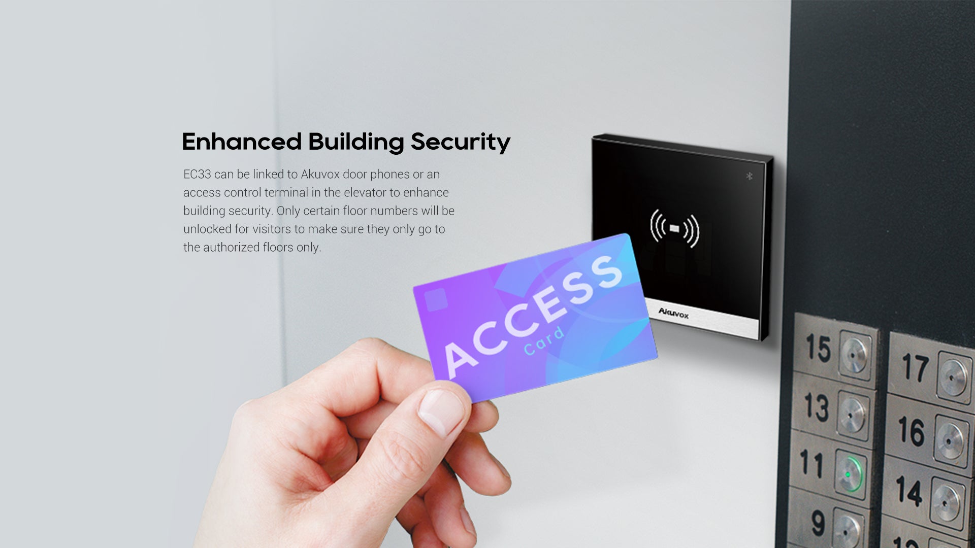 Akuvox EC33 is an IP-based elevator access controller, which works with all Akuvox intercoms and access control terminals. It is typically used in multifamily and office buildings to enhance building access security.