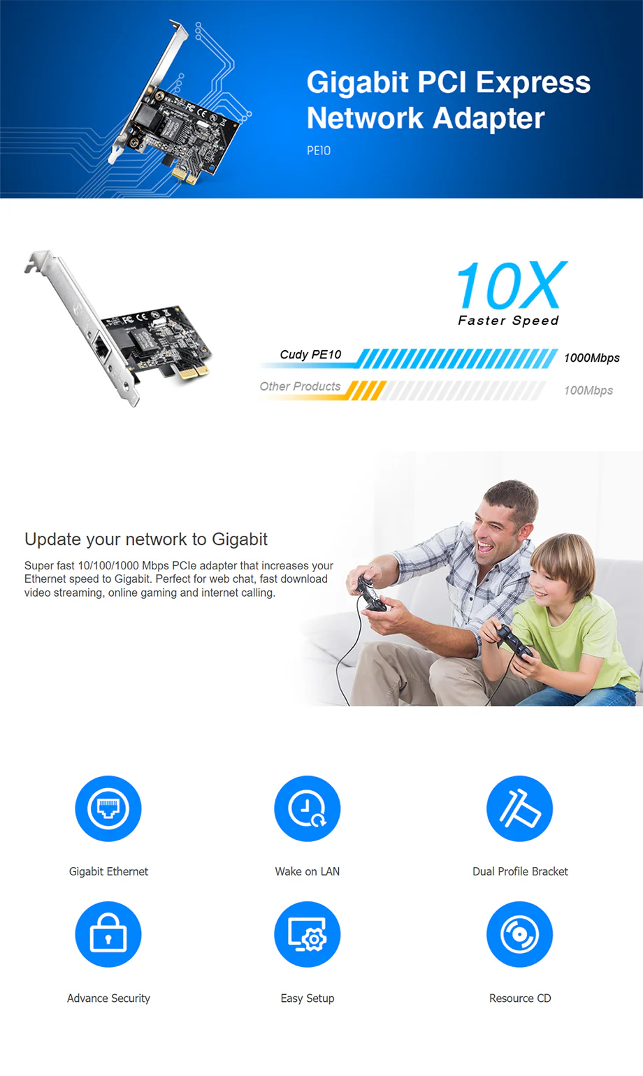 A NIC for equipping your PC with Gigabit wired connectivity, featuring WoL function.