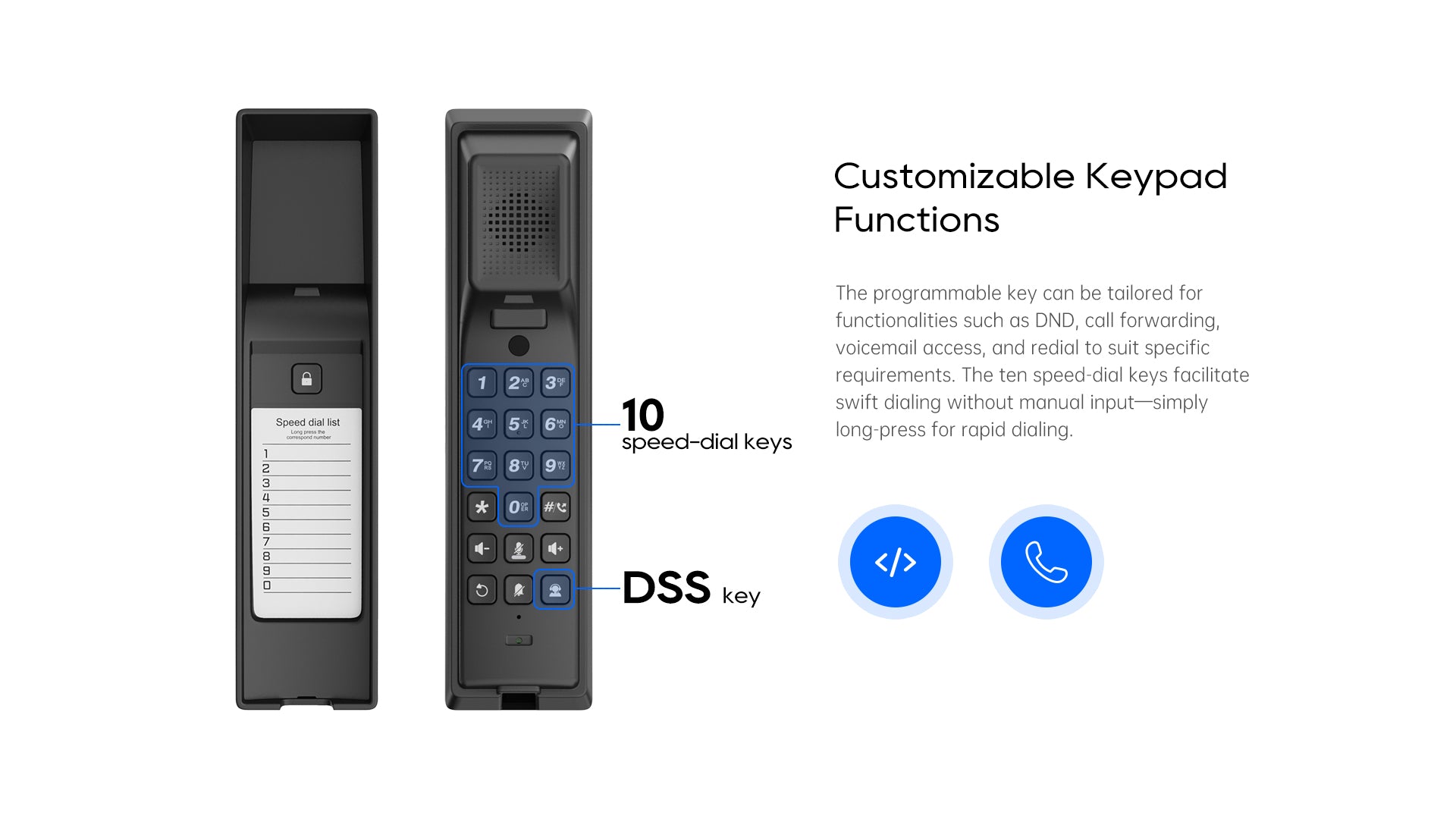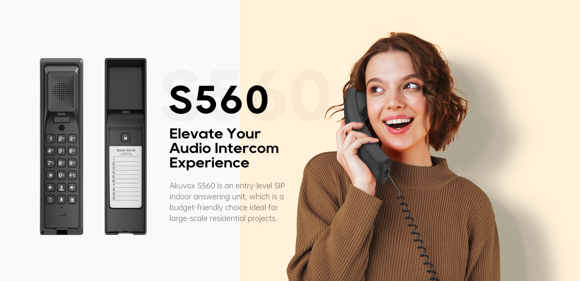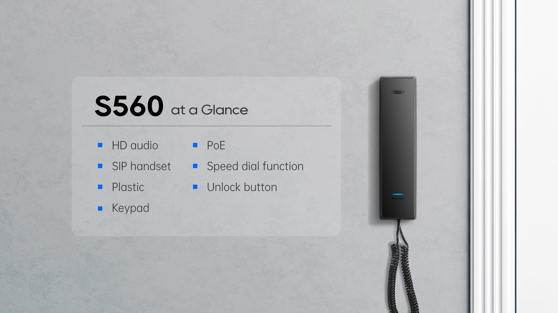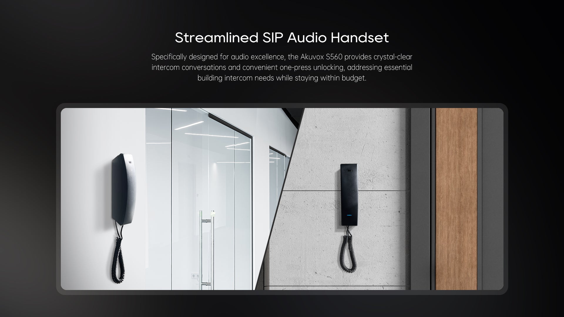 The Akuvox S560 is a SIP-based handset intercom. It supports basic intercom functions, such as intercom calling and door unlocking, and can be installed on a wall or placed on a desktop. With a compact and minimalist design, it is an ideal choice for smaller areas and serves perfectly as an extension unit.